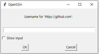 이후에는 그냥 평상시처럼 git push, git pull 등의 작업을 진행하면 된다. 초기화 후에 git push나 git pull을 할 경우, 최초 1회에 한해서 계정 정보를 입력하라는 창이 뜬다. 아래와 같이 첫번째 창이 출력되면 git 로그인 계정을 입력하고 "OK"를 누른다.