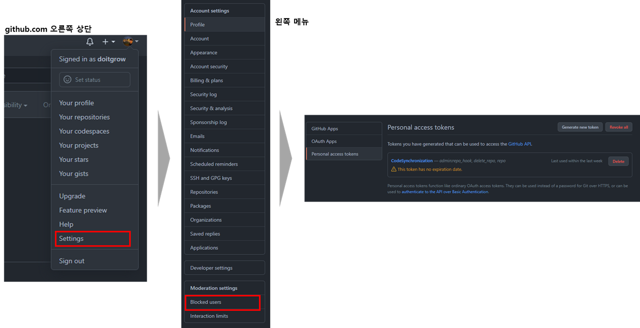 아래와 같은 순서로 "Personal access tokens"를 발급받을 수 있으며, 토큰 정보는 한번만 보여주고 재발행할 때까지는 다시 볼 수 없으니 잘 적어두어야 한다.
