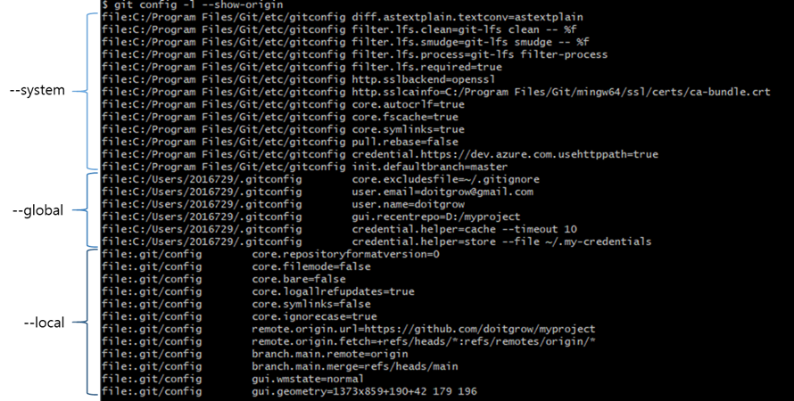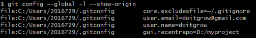git bash에 아래 명령어를 입력하면 총 3가지의 다른 경로에서 관리하고 있는 환경설정 값들이 보인다.